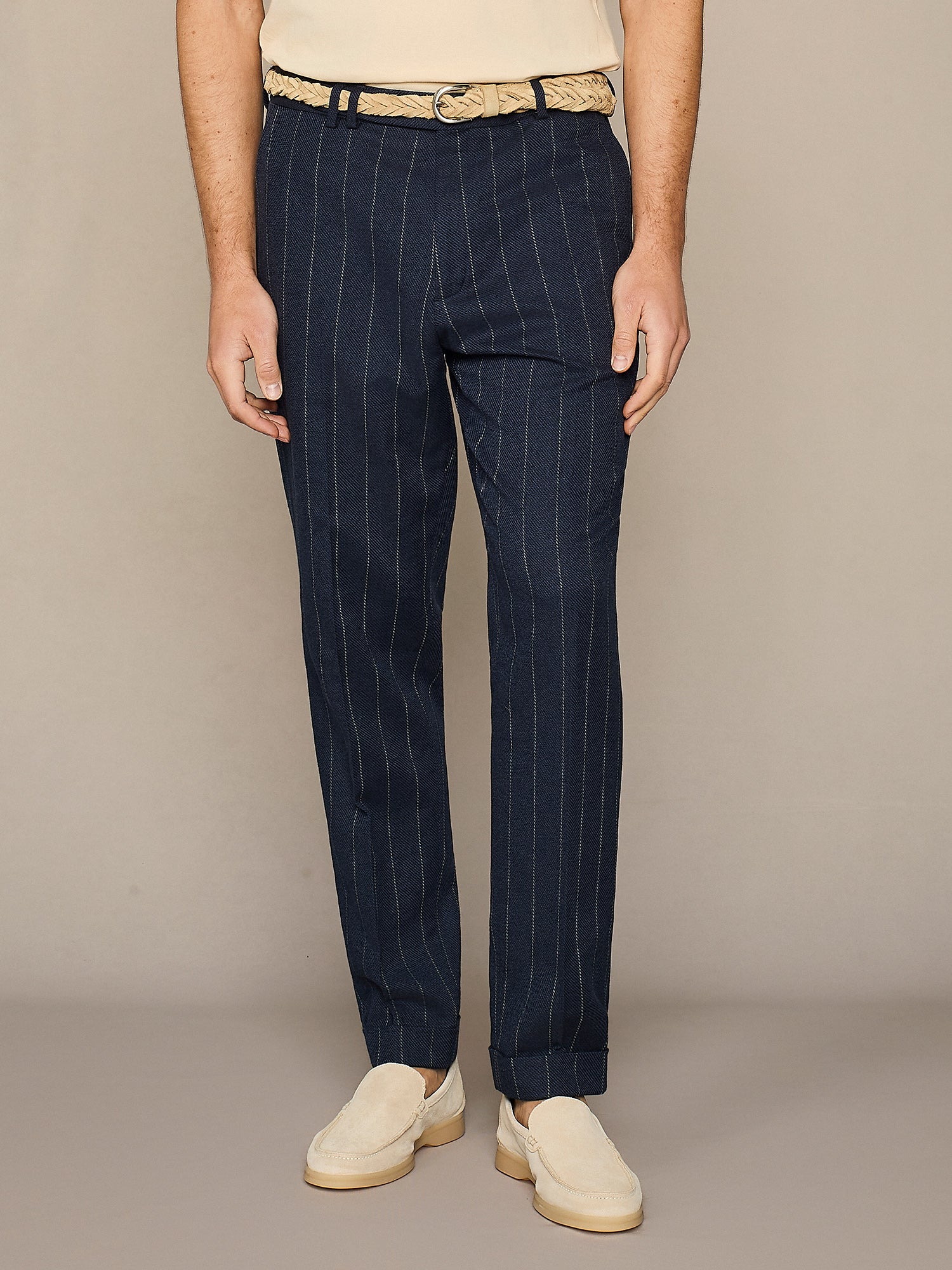 NAVY LINEN BLEND PINSTRIPED TROUSERS